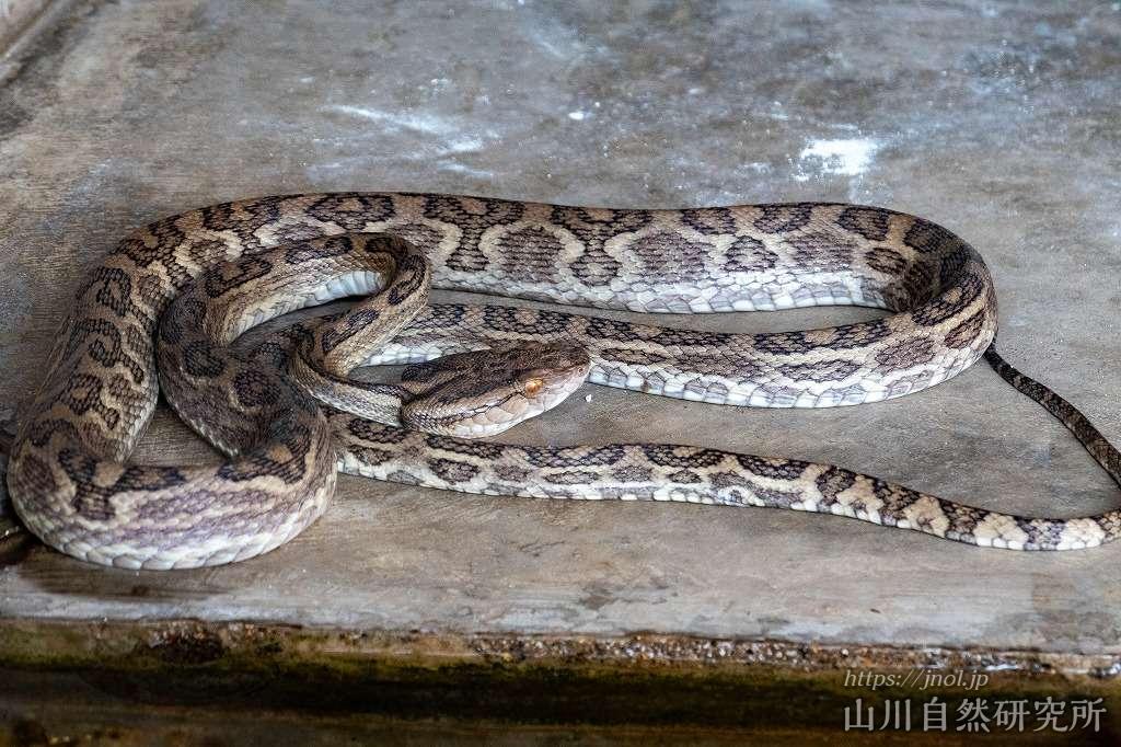 徳之島には、このカラータイプだけではなく、他の島のハブに似た黄色味の強いタイプもいて、色に個体差があります。