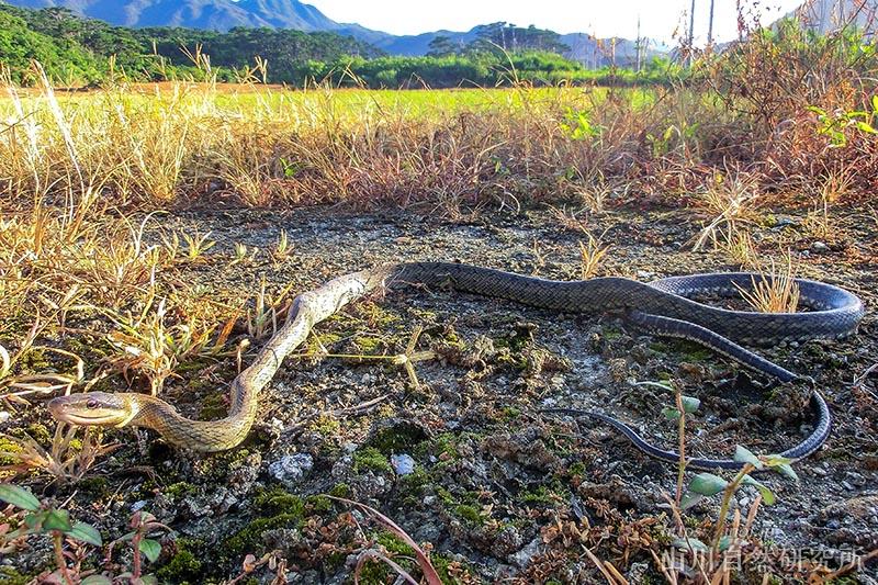 体を温めるために道路に出てくることが多く、朝や夕方など気温が下がっている時に出てきやすいです。写真のサキシマスジオは道路上でカラスの集団に襲われていたのを、筆者が助けてあげた個体。