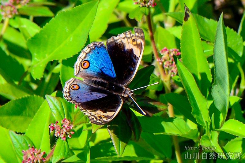 写真はオスの個体。オスは美しく派手な青色をしていますが、メスは茶褐色で目玉模様が大きくなります(青色タイプのメスもおり変異があります)。