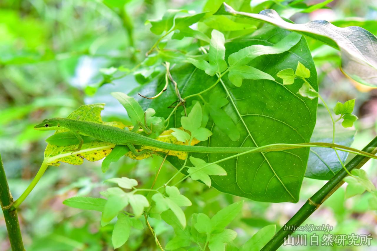 この種の減少の要因は、販売目的の採集圧も大きかったと思われます。これに似た緑色のカナヘビは他に、宮古島のミヤコカナヘビ、奄美群島・沖縄諸島のアオカナヘビがいます。